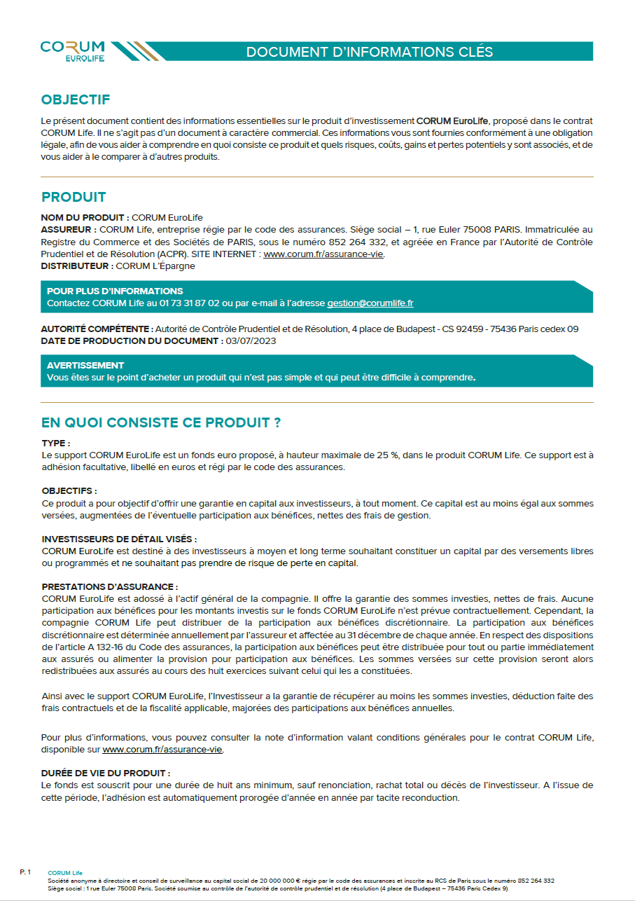 CORUM Life est un contrat composé d’unités de compte et d’un fonds euro. Les unités de compte sont sujettes à des fluctuations, à la hausse ou à la baisse. Elles présentent des risques de perte en capital dépendant en particulier de l’évolution des marchés financiers ou immobiliers. Les performances passées ne préjugent pas des performances futures.